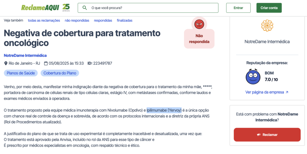 Assim como você, outras pessoas passam pela mesma situação. No portal reclameaqui encontramos diversas reclamações sobre negativa de Ipilimumabe (Yervoy®), confira: