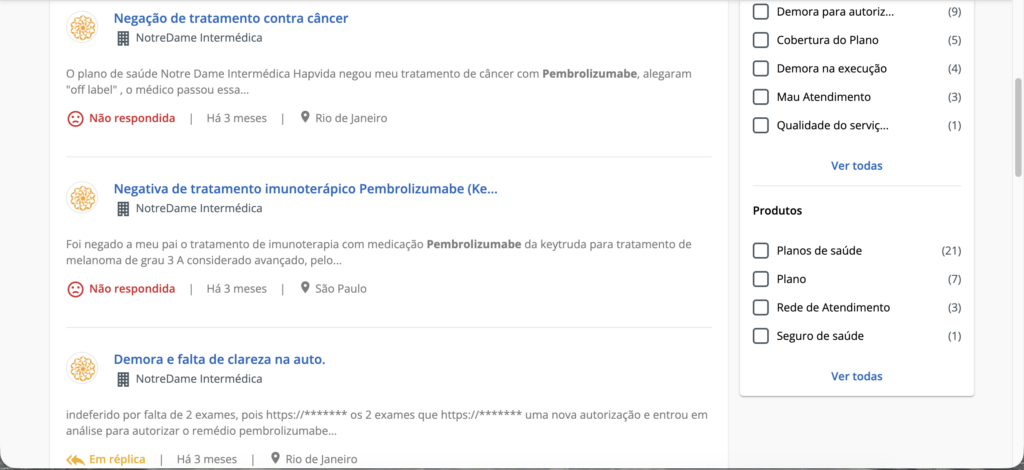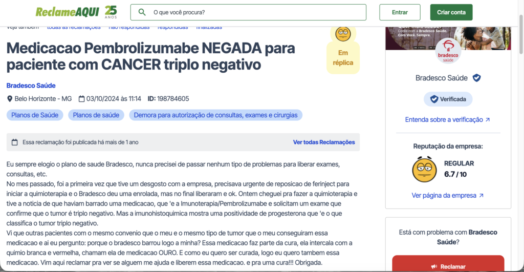 Saiba que você não está sozinho(a). Outros planos de saúde negam o fornecimento de Pembrolizumabe com o mesmo argumento que você está enfrentando. Veja abaixo no site ReclameAqui o que os consumidores dizem: